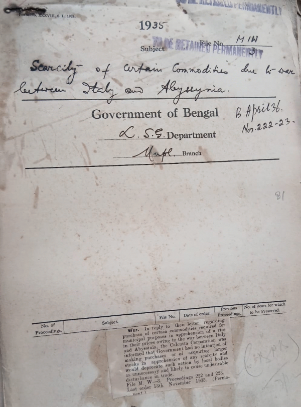 | Rack No. 12, Bundle No. 05 Sl No. 278 Exemption of the Chairman Calcutta Improvement Trust from the Payment of the Contribution for Passage Concessions. | Rack No. 12, Bundle No. 05 Sl No. 279 Liability of the Jute Mills Situated in the municipal areas to pay of the tax on professions, trades and Callings. | Rack No. 12, Bundle No. 05 Sl No. 280 Disposal of 25.82 acres of land relinquished by the Eastern Bengal Railway in village Tepakhola Gopalpur ete in the District of Faridpur. | Rack No. 12, Bundle No. 05 Sl No. 281 Scarcity of certain commodities due to war between 1935 Italy and Abyssinia. | Rack No. 12, Bundle No. 05 Sl No. 282 Post Pavement of the revision of assessment of the Nabadwip Municipality. | Rack No. 12, Bundle No. 05 Sl No. 283 C.Q. by Babu Amulyadhan Roy regarding Scheduled caste representation the Calcutta Corporation | Rack No. 12, Bundle No. 05 Sl No. 284 Supply of Certain provincial publications fee of cost to the British library of Information at New York. |