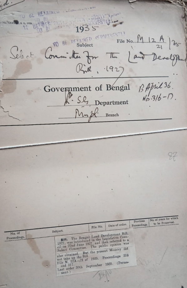 | Rack No. 12, Bundle No. 05 Sl No. 284 Supply of Certain provincial publications fee of cost to the British library of Information at New York. | Rack No. 12, Bundle No. 05 Sl No. 285 Adoption of Rule 8A of the model Provident fund Rule model provident fund Rule by the Muktagacha Municipality. | Rack No. 12, Bundle No. 05 Sl No. 286 Irregularity in the election of U.C, Jalpaiguri Municipality. | Rack No. 12, Bundle No. 05 Sl No. 287 Select committee for the Land Development Bill, 1927. | Rack No. 12, Bundle No. 05 Sl No. 288 L.A. by the Calcutta Improvement Trust for alignment No. II (Dharmtola Street Extension). | Rack No. 12, Bundle No. 05 Sl No. 289 L.A. by the C.9 Trust for Alignment No IX (Shambazar Street to Gallif Street). | Rack No. 12, Bundle No. 05 Sl No. 290 Proposed increment in rates levied for the release of impounded Cattle |