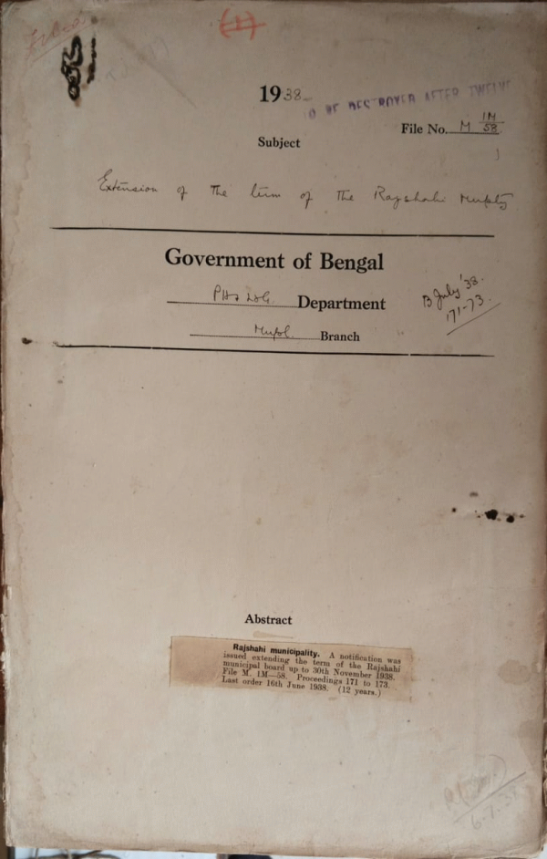 | Rack No. 12, Bundle No. 12, Sl No. 832 Amendment to the Fundamental and Subsidiary Rules. | Rack No. 12, Bundle No. 12, Sl No. 833 List of new major works proposed to the included in the 50 civil works Budget, 1939-40. | Rack No. 12, Bundle No. 12, Sl No. 834 Adoption of model bye-laws regarding Prohibition and Regulation of Traffic, by the Rajshahi Municipality | Rack No. 12, Bundle No. 12, Sl No. 835 Extension of the term of the Rajshahi Municipality. | Rack No. 12, Bundle No. 13, Sl No. 836 The Calcutta Municipal (Second Amendment) Act, 1935. | Rack No. 12, Bundle No. 13, Sl No. 837 The Calcutta Municipal (Second Amendment) Act, 1936. | Rack No. 12, Bundle No. 13, Sl No. 838 Application of municipal funds towards expenditure on ceremonial occasions. |