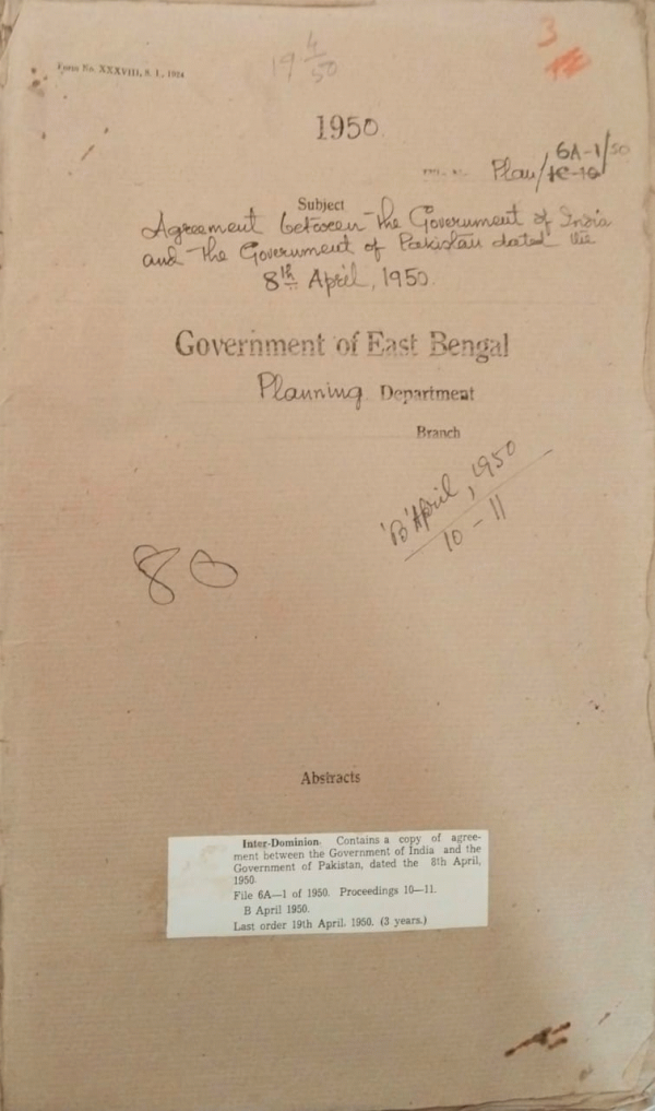 | Rack No. 36, Bundle No. 01, SI No. 84 Contains miscellanies papers concerning separation office for East Bengal Shillong. | Rack No. 36, Bundle No. 01, SI No. 85 Retention of the temporary office staff for a further period of one year with effect from 1st March, 1950. | Rack No. 36, Bundle No. 01, SI No. 86 Trade agreement between Pakistan and Egypt. | Rack No. 36, Bundle No. 01, SI No. 87 Agreement between the government of India and the government of Pakistan dated the 8th april,1950. | Rack No. 36, Bundle No. 01, SI No. 88 Vote on the genesis of communal disturbances in west bengal. | Rack No. 36, Bundle No. 01, SI No. 89 Registration of foreigners. | Rack No. 36, Bundle No. 01, SI No. 90 Eligibility of government servants to stand as candidates for election to local bodies. |