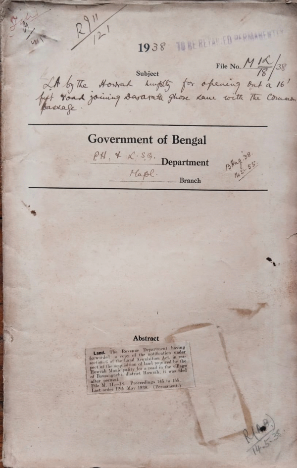| Rack No. 12, Bundle No. 13, Sl No. 838 Application of municipal funds towards expenditure on ceremonial occasions. | Rack No. 12, Bundle No. 13, Sl No. 839 Commutation of a portion of pension, Mr. James Gawler, Late Station officer, Calcutta Fire Brigade. | Rack No. 12, Bundle No. 13, Sl No. 840 Sanction of Govt. to the Purchase of a new Brief size "Special" model Underwood Type-Writer. | Rack No. 12, Bundle No. 13, Sl No. 841 L.A. by the Howrah Municipality for opening out a 16 feet road joining Dasharath Ghosh Lane. | Rack No. 12, Bundle No. 13, Sl No. 842 L.A. by the C.I. Trust for alignment No. VIII (Maniktala) from Beliaghata Main Road to Narkeldanga Main Road. | Rack No. 12, Bundle No. 13, Sl No. 843 Inspection note of the English Bazar Municipality. | Rack No. 12, Bundle No. 13, Sl No. 844 A Copy of letter from the communication and works Department transferring to the Darjeeling municipality certain roads falling within the limits. |