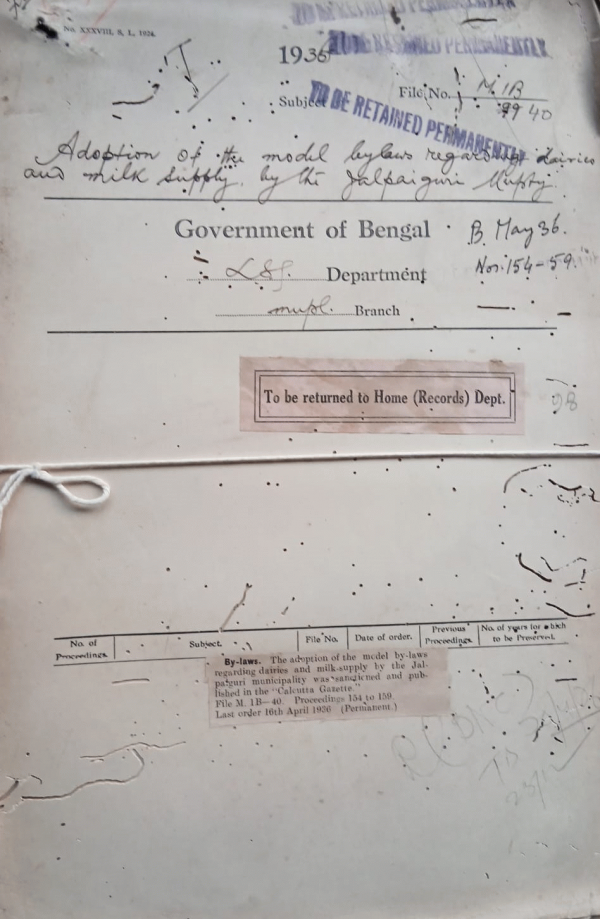 | Rack No. 12, Bundle No. 05 Sl No. 295 Extension of Section 115 of the B.M. Act, 1932 to the Netrakona Municipality. | Rack No. 12, Bundle No. 05 Sl No. 296 Passage contribution for British military officers and others of Army Department in India. | Rack No. 12, Bundle No. 05 Sl No. 297 Report on the Municipal Administration and Finances in the U.P. during the year 1933-34. | Rack No. 12, Bundle No. 05 Sl No. 298 Adoption of the model bye-laws regarding dairies and Milk-Supply by the Jalpaiguri Municipality. | Rack No. 12, Bundle No. 05 Sl No. 299 L.A. by the Scrampore Municipality for widening the Bosepara Lane in Mahesh | Rack No. 12, Bundle No. 05 Sl No. 300 Abstract Catalogue of the Records Preserved in the Civil Secratariate Record Room from 1859. | Rack No. 12, Bundle No. 05 Sl No. 301 Adoption of the model by-laws for control etc of Dangerous disease (Cholera, Small Pox, Plague) by the Pabna Municipality |