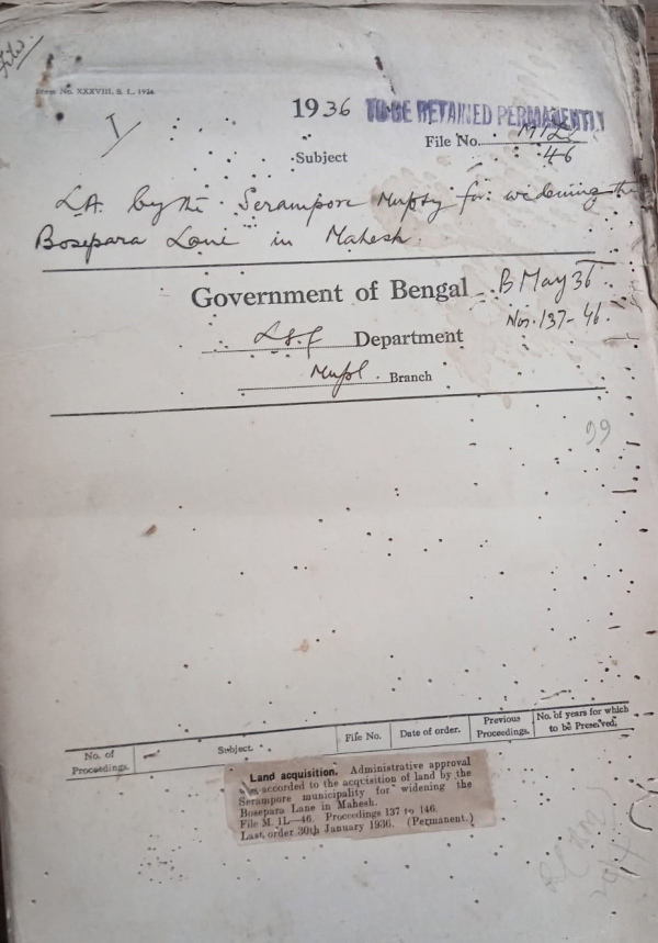 | Rack No. 12, Bundle No. 05 Sl No. 296 Passage contribution for British military officers and others of Army Department in India. | Rack No. 12, Bundle No. 05 Sl No. 297 Report on the Municipal Administration and Finances in the U.P. during the year 1933-34. | Rack No. 12, Bundle No. 05 Sl No. 298 Adoption of the model bye-laws regarding dairies and Milk-Supply by the Jalpaiguri Municipality. | Rack No. 12, Bundle No. 05 Sl No. 299 L.A. by the Scrampore Municipality for widening the Bosepara Lane in Mahesh | Rack No. 12, Bundle No. 05 Sl No. 300 Abstract Catalogue of the Records Preserved in the Civil Secratariate Record Room from 1859. | Rack No. 12, Bundle No. 05 Sl No. 301 Adoption of the model by-laws for control etc of Dangerous disease (Cholera, Small Pox, Plague) by the Pabna Municipality | Rack No. 12, Bundle No. 05 Sl No. 302 Govt. Contribution to the fringe area drainage scheme for the year 1935-36. |