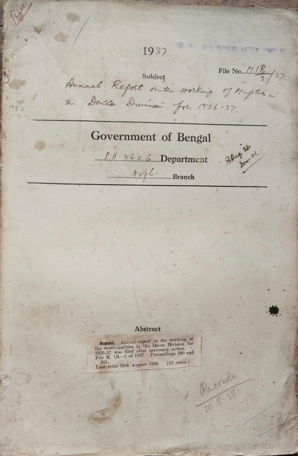 | Rack No. 12, Bundle No. 13, Sl No. 856 Exchange of optical Publication between this Govt. and the Govt. of Punjab. | Rack No. 12, Bundle No. 13, Sl No. 857 Administrative approval was accorded to the acquisition of land. | Rack No. 12, Bundle No. 13, Sl No. 858 C.Q. by Mr. Hamidul Huq Chowdhury regarding the abolition of the Jute duty levied on behalf of the Cal. 9. Trust. | Rack No. 12, Bundle No. 13, Sl No. 859 Annual report on the working of the municipalities in the Dacca Division for 1936-37. | Rack No. 12, Bundle No. 13, Sl No. 860 Adoption of Rule 5A of the Provident fund Rules by the Vishnupur Municipality. | Rack No. 12, Bundle No. 13, Sl No. 861 Extension of term of the Netrakona Municipality. | Rack No. 12, Bundle No. 13, Sl No. 862 L.A by the Garden Reach Municipality for theConstruction of a free Municipal Primary SchoolPremises on the Badartolla Road. |