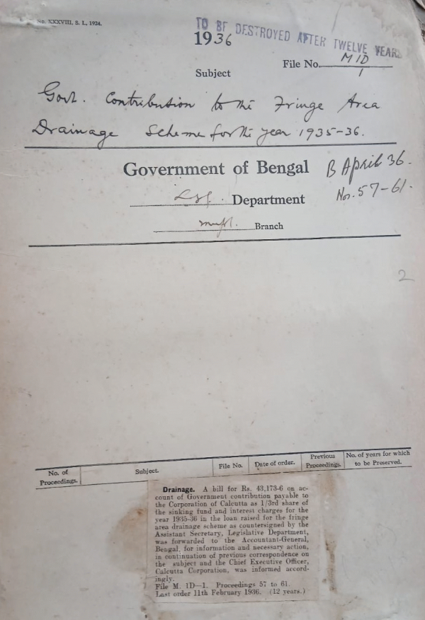 | Rack No. 12, Bundle No. 05 Sl No. 299 L.A. by the Scrampore Municipality for widening the Bosepara Lane in Mahesh | Rack No. 12, Bundle No. 05 Sl No. 300 Abstract Catalogue of the Records Preserved in the Civil Secratariate Record Room from 1859. | Rack No. 12, Bundle No. 05 Sl No. 301 Adoption of the model by-laws for control etc of Dangerous disease (Cholera, Small Pox, Plague) by the Pabna Municipality | Rack No. 12, Bundle No. 05 Sl No. 302 Govt. Contribution to the fringe area drainage scheme for the year 1935-36. | Rack No. 12, Bundle No. 05 Sl No. 303 License fee, Jessore Municipality. | Rack No. 12, Bundle No. 05 Sl No. 304 Calcutta Corporation: Conversion of Carts to lorries for conservancy service in the district I and II. | Rack No. 12, Bundle No. 05 Sl No. 305 L.A. by the Calcutta Improvement Trust for Scheme No. XLI (Schandri Chak street widening from Dhurumtola Street to Prinsep Street). |