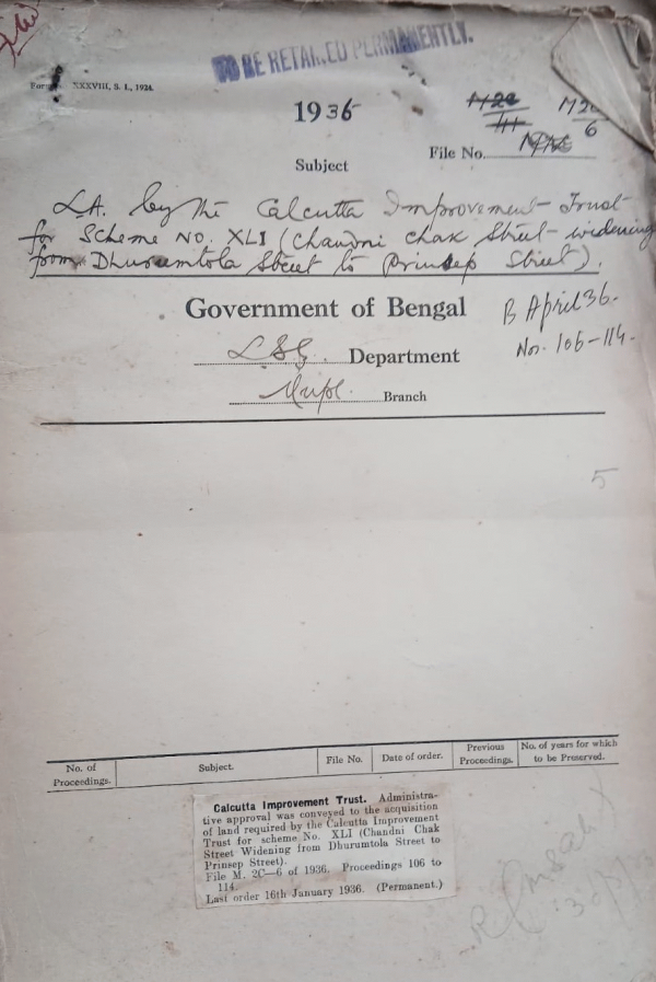 L.A. by the Calcutta Improvement Trust for Scheme No. XLI (Schandri Chak street widening from Dhurumtola Street to Prinsep Street).