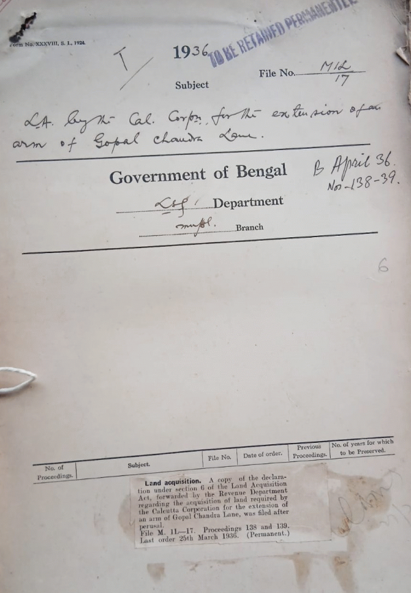 | Rack No. 12, Bundle No. 05 Sl No. 303 License fee, Jessore Municipality. | Rack No. 12, Bundle No. 05 Sl No. 304 Calcutta Corporation: Conversion of Carts to lorries for conservancy service in the district I and II. | Rack No. 12, Bundle No. 05 Sl No. 305 L.A. by the Calcutta Improvement Trust for Scheme No. XLI (Schandri Chak street widening from Dhurumtola Street to Prinsep Street). | Rack No. 12, Bundle No. 05 Sl No. 306 L.A. by Cal. Corporation for the extension of anarm of Gopal Chandra Lane. | Rack No. 12, Bundle No. 05 Sl No. 307 Adoption of Rule 8A of the Model Provident fund Rules, by the Jiaguj-Azimganj Municipality. | Rack No. 12, Bundle No. 05 Sl No. 308 L.A. by the Dacca Municipality by widening and opening out a cart way from Bhagabat Prasanna Sankharidhi Strat. | Rack No. 12, Bundle No. 05 Sl No. 309 Grant of an advance to Rai Sahib Anukul Chandra Mallik, H.A. L.S.G. Department from his G.P. Fund Accounts. |