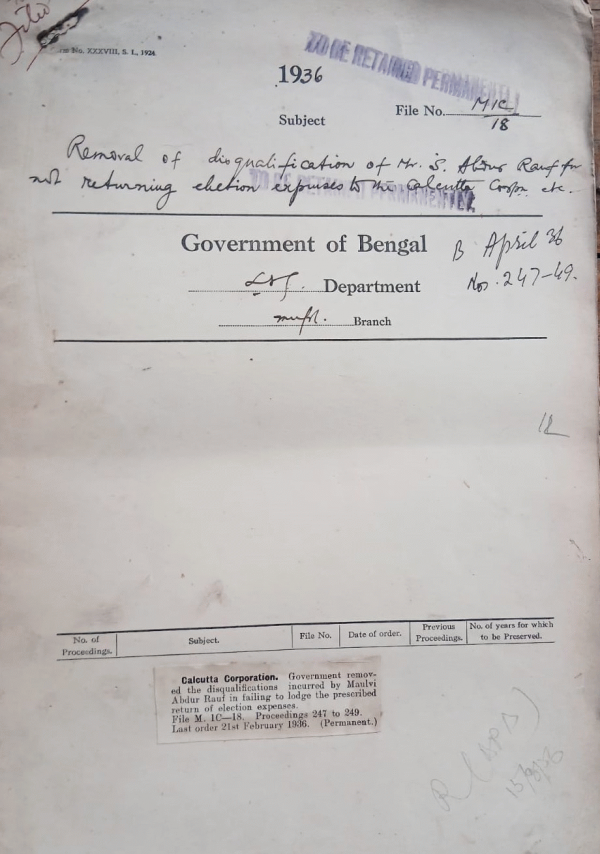 Removal of disqualification of Mr. S. Abdur Rauf for not returning election expenses to the Calcutta Corporation etc.