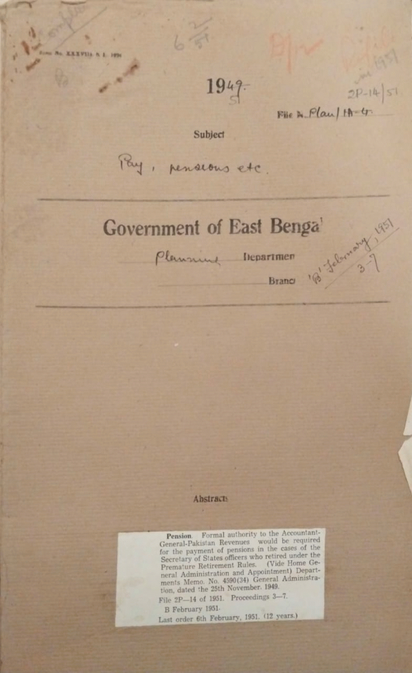 | Rack No. 36, Bundle No. 02, SI No. 111 The Pakistan Flag. | Rack No. 36, Bundle No. 02, SI No. 112 Rising of subscription by government servants. | Rack No. 36, Bundle No. 02, SI No. 113 Government servanta conduct rules. | Rack No. 36, Bundle No. 02, SI No. 114 Pay,Pensions etc. | Rack No. 36, Bundle No. 02, SI No. 115 Absorption of the staff of separation office for East-Bengal at shillong. | Rack No. 36, Bundle No. 02, SI No. 116 Technical assistance for economic development through the U.N.O. | Rack No. 36, Bundle No. 02, SI No. 117 Memorandum on pipe requirement by U.S. steel expert Companys. |