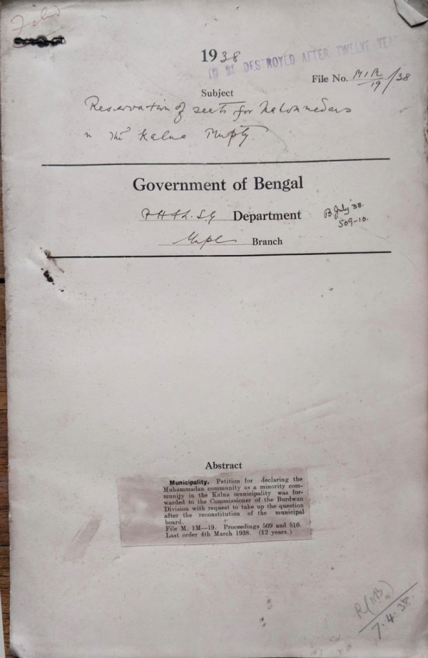 | Rack No. 12, Bundle No. 13, Sl No. 861 Extension of term of the Netrakona Municipality. | Rack No. 12, Bundle No. 13, Sl No. 862 L.A by the Garden Reach Municipality for theConstruction of a free Municipal Primary SchoolPremises on the Badartolla Road. | Rack No. 12, Bundle No. 13, Sl No. 863 Appointment of an Accountant Narayanganj Municipality | Rack No. 12, Bundle No. 13, Sl No. 864 Reservation of Seats for Muhammadan in the Kalna Municipality, | Rack No. 12, Bundle No. 13, Sl No. 865 Adoption of the bye-laws regarding Sarais,Dharmasalas and other loading houses by the Bally Municipality. | Rack No. 12, Bundle No. 13, Sl No. 866 Extension of Service of Mr. Fledrick, Chief officer Calcutta Fire Brigade. | Rack No. 12, Bundle No. 13, Sl No. 867 Extension of Section 424 of the B.M. Act to the Brahmanbaria Municipality. |