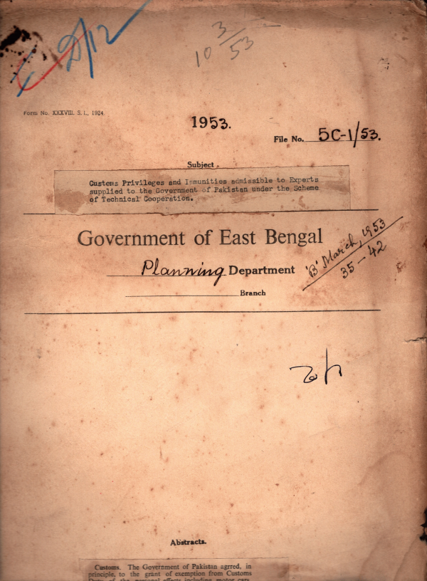 | Rack No. 37, Bundle No. 07, SI No. 359 Separation of Judicial records of the Disstrict of Sylhet. | Rack No. 37, Bundle No. 07, SI No. 360 U,N, Advisory Social welfare scholarship Fellowship Programme for 1953 | Rack No. 37, Bundle No. 07, SI No. 361 Terms allowed to fellowship holders under the scheme of Technical Assistance to Pakistan. | Rack No. 37, Bundle No. 07, SI No. 362 Customs Privileges and Immunities admissible to Experts supplied to the Government of Pakistan under the Scheme of Technical Cooperation | Rack No. 37, Bundle No. 07, SI No. 363 Training in Agricultural Extension methods in the U.S.A. | Rack No. 37, Bundle No. 07, SI No. 364 Visit of MR-S.K. Dey Asministrator village Community Project, Govt. of India. | Rack No. 37, Bundle No. 07, SI No. 365 Function of F.O, A. Programme Co-ordinate. |