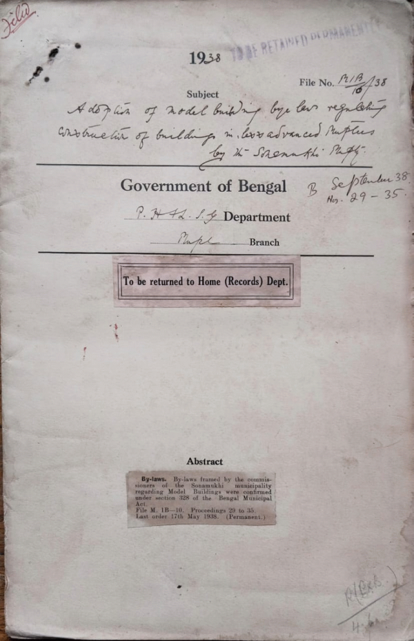 | Rack No. 12, Bundle No. 13, Sl No. 868 Inspection Note, Gaibandha Municipality. | Rack No. 12, Bundle No. 13, Sl No. 869 Maniktala Sewerage Scheme. | Rack No. 12, Bundle No. 13, Sl No. 870 Sanction to the expenditure of Rs. 600/- by the Tollygunge Municipality u/s. 108 (XXXVIII) of theB.M. Act. | Rack No. 12, Bundle No. 13, Sl No. 871 Adoption of model bye-laws regulating constructionof buildings in legs advanced municipalities by the Sanamukhi Municipality. | Rack No. 12, Bundle No. 13, Sl No. 873 Nomination of members from the Scheduled castesin Local Self-Governing bodies. | Rack No. 12, Bundle No. 13, Sl No. 874 Extension of Service of Mr. J.N. Das Gupta, DeputyEngineers Cal. Improvement Trust. | Rack No. 12, Bundle No. 13, Sl No. 875 Transfer of the Passage between 124 and 134/2 Ashutosh Mukherjee Road to the Corporation of Calcutta |