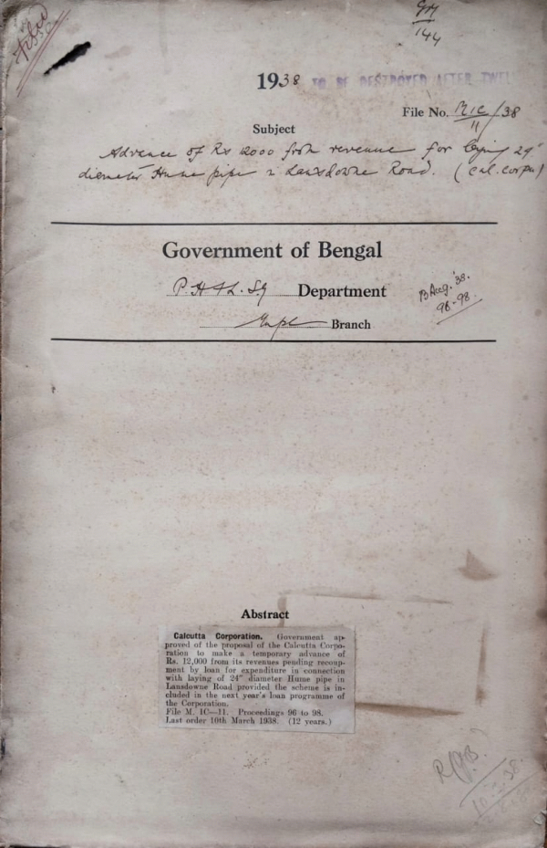 | Rack No. 12, Bundle No. 13, Sl No. 876 Copied of His Excellency's reply to the address Presented at Darjeeling. | Rack No. 12, Bundle No. 13, Sl No. 877 A.Q. by Mr. Niharendu Dutta Mazumdar regarding nominations of members to represent labour in theMunicipal bodies. | Rack No. 12, Bundle No. 13, Sl No. 878 Appointment of a Commissioner, Tamluk Municipality. | Rack No. 12, Bundle No. 13, Sl No. 879 Advance of Rs. 12000 from revenue for laying 24"diameter Hume Pipe in Lansdowne Road. | Rack No. 12, Bundle No. 13, Sl No. 880 Audit objection to the expenditure of Rs. 3/-incurred by the Chairman and V.C, ChakdahMunicipality for inspecting roads and wells. | Rack No. 12, Bundle No. 13, Sl No. 881 Motor Car Advance to Mr. Nihar Ch. Chakravarti,Dy. Collector. | Rack No. 12, Bundle No. 13, Sl No. 882 L.A. by the Howrah Municipality for wideningsome portions of Prosonnal Kumar Dutta. Road andextending it up to Doyal Danarji Road. |