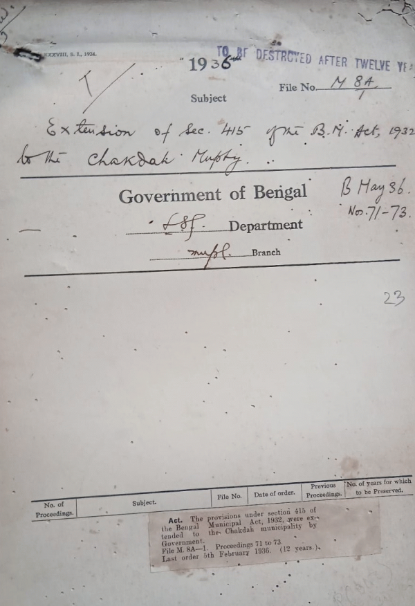 | Rack No. 12, Bundle No. 05 Sl No. 320 Adoption of the model by-laws regarding maintenance of Survey maps by the Bhatpara Municipality. | Rack No. 12, Bundle No. 05 Sl No. 321 L.A. by the Bankura Municipality at village Bankur for effecting Sanitary improvement of that Municipality. | Rack No. 12, Bundle No. 05 Sl No. 322 L.A. by the Kushtia Municipality for a burial ground at Kalisankarpur. | Rack No. 12, Bundle No. 05 Sl No. 323 Extension of Section 415 of the B.M. Ac, 1932 to the Chakdah Municipality. | Rack No. 12, Bundle No. 05 Sl No. 324 Procedure for the Condemnation and Scale of unserviceable type writers. | Rack No. 12, Bundle No. 05 Sl No. 325 L.A. by the Chittagong Municipality for the improvement of a Lane in Kazir Deweri. | Rack No. 12, Bundle No. 05 Sl No. 326 Withdrawal of the concessions granted Funds during the emergency out in pay. |