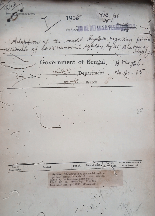 | Rack No. 12, Bundle No. 05 Sl No. 324 Procedure for the Condemnation and Scale of unserviceable type writers. | Rack No. 12, Bundle No. 05 Sl No. 325 L.A. by the Chittagong Municipality for the improvement of a Lane in Kazir Deweri. | Rack No. 12, Bundle No. 05 Sl No. 326 Withdrawal of the concessions granted Funds during the emergency out in pay. | Rack No. 12, Bundle No. 05 Sl No. 327 Adoption of the model bye-laws regarding privies, urinal of band removal system, by the Bhatpara Municipality. | Rack No. 12, Bundle No. 05 Sl No. 328 The Bengal Financial Rules regarding limitation of the financial powers of officers to make purchase of stores. | Rack No. 12, Bundle No. 05 Sl No. 329 L.A. by the Serampore Municipality for the quarters of the priest of Ballavpur burning ghat. | Rack No. 12, Bundle No. 05 Sl No. 330 L.A. by the Howrah Municipality for casing out a bad corner at Kasinath Chatterjee Lane. |