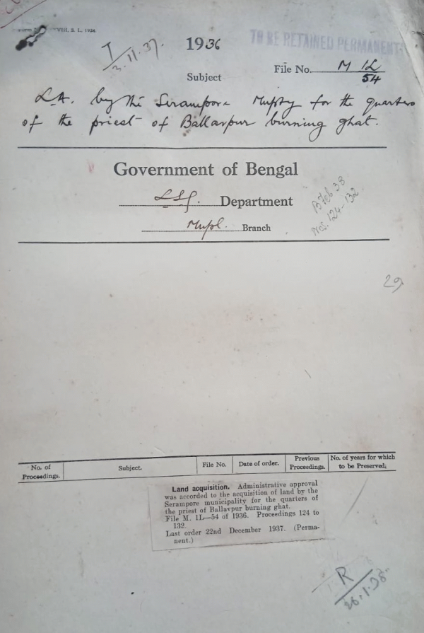 | Rack No. 12, Bundle No. 05 Sl No. 326 Withdrawal of the concessions granted Funds during the emergency out in pay. | Rack No. 12, Bundle No. 05 Sl No. 327 Adoption of the model bye-laws regarding privies, urinal of band removal system, by the Bhatpara Municipality. | Rack No. 12, Bundle No. 05 Sl No. 328 The Bengal Financial Rules regarding limitation of the financial powers of officers to make purchase of stores. | Rack No. 12, Bundle No. 05 Sl No. 329 L.A. by the Serampore Municipality for the quarters of the priest of Ballavpur burning ghat. | Rack No. 12, Bundle No. 05 Sl No. 330 L.A. by the Howrah Municipality for casing out a bad corner at Kasinath Chatterjee Lane. | Rack No. 12, Bundle No. 08 Sl No. 476 C.Q. by Babu Haribashu Roy regarding Commissioners of the Hoogly Chinsura Municipality increasing the number Commissioner. | Rack No. 12, Bundle No. 08 Sl No. 477 C.Q. by Dr. Haridham Datta Bahadur regarding location of Talkie Houses, Chinemas etc. in Calcutta. |