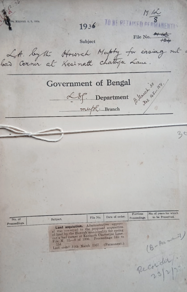 | Rack No. 12, Bundle No. 05 Sl No. 327 Adoption of the model bye-laws regarding privies, urinal of band removal system, by the Bhatpara Municipality. | Rack No. 12, Bundle No. 05 Sl No. 328 The Bengal Financial Rules regarding limitation of the financial powers of officers to make purchase of stores. | Rack No. 12, Bundle No. 05 Sl No. 329 L.A. by the Serampore Municipality for the quarters of the priest of Ballavpur burning ghat. | Rack No. 12, Bundle No. 05 Sl No. 330 L.A. by the Howrah Municipality for casing out a bad corner at Kasinath Chatterjee Lane. | Rack No. 12, Bundle No. 08 Sl No. 476 C.Q. by Babu Haribashu Roy regarding Commissioners of the Hoogly Chinsura Municipality increasing the number Commissioner. | Rack No. 12, Bundle No. 08 Sl No. 477 C.Q. by Dr. Haridham Datta Bahadur regarding location of Talkie Houses, Chinemas etc. in Calcutta. | Rack No. 12, Bundle No. 08 Sl No. 478 C.Q. by Raja Bhupendra Narayan of Nashipur regarding Population of the Murshidabad Municipality. |