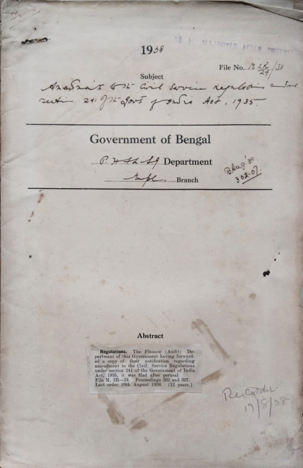 | Rack No. 12, Bundle No. 13, Sl No. 887 Amendment on the Civil Service Rules. | Rack No. 12, Bundle No. 13, Sl No. 888 Indian electric Rules, 1922. | Rack No. 12, Bundle No. 13, Sl No. 889 Petition by Ashutosh Banerji and others for inclusion of their names in the Electoral roll of the North barrackpore Municipality. | Rack No. 12, Bundle No. 13, Sl No. 890 Amendment to the Civil Service Regulation under Section 241 of the Govt. of India Act, 1935. | Rack No. 12, Bundle No. 13, Sl No. 891 Calcutta I.T. loan of Rs. 20lakhs form of debenture. | Rack No. 12, Bundle No. 13, Sl No. 892 A.Q. by Mr. N. Dutta Matumdar, regarding Establishment of a hospital by Calcutta Corporation at Dum Dum for infectious Disease. | Rack No. 12, Bundle No. 13, Sl No. 893 L.A. by the C.I. Trust for alignment No. IV Muniktola and Ultadingi Main Road. |
