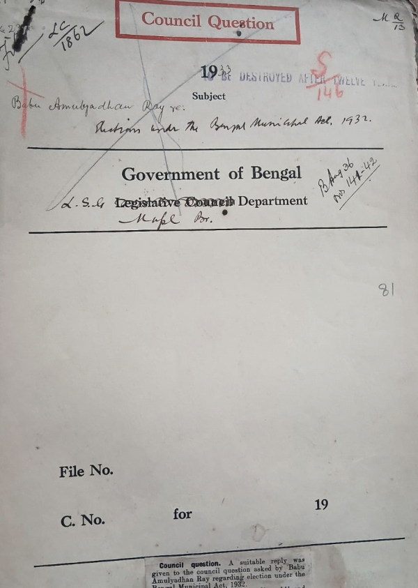 | Rack No. 12, Bundle No. 08 Sl No. 478 C.Q. by Raja Bhupendra Narayan of Nashipur regarding Population of the Murshidabad Municipality. | Rack No. 12, Bundle No. 08 Sl No. 479 C.Q. by Bazi Emdadul Haque regarding nominated Commissioners of Howrah Municipality. | Rack No. 12, Bundle No. 08 Sl No. 480 C.Q. by Nawab Musharraf Hossain regarding further amendment of the Calcutta Municipality Act. | Rack No. 12, Bundle No. 08 Sl No. 481 C.Q. by Babu Amulyadhan Roy regarding electio nunder the Bengal municipal Act, 1932 . | Rack No. 12, Bundle No. 08 Sl No. 482 C.Q. by Raja Bhupendra Narayan of Nashipur regarding the election of the Murshidabad Municipality. | Rack No. 12, Bundle No. 08 Sl No. 483 L.A. by the Baranagaore municipality for widening a portion of Kalidas Lahiri Lane. | Rack No. 12, Bundle No. 08 Sl No. 484 Notes of Audit of the Accounts of the Serajganj Municipality Pabna for 1933-34. |