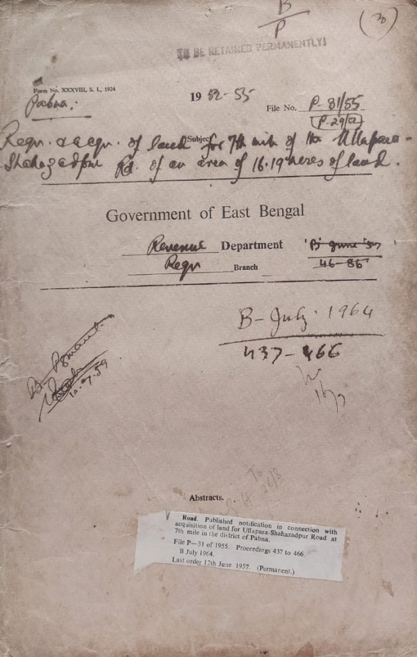| Rack No. 42, Bundle No. 01, Sl No. 06 Takid for return of papers issued from Record Room on Requisition. | Rack No. 42, Bundle No. 01, Sl No. 06 Grant of relief from the Imperial Indian Relief fund to the families of Indian officers and men of Bengal killed in the war. | Rack No. 42, Bundle No. 01, Sl No. 06 Petition for Khan Saheb Mvi. Md. Mozammel for appointment of his son as an Assistant income tax office. | Rack No. 42, Bundle No. 01, Sl No. 06 Acquisition of land for Ullapara-Shahazadpur Road at 7th mile in the district of Pabna. | Rack No. 42, Bundle No. 01, Sl No. 07 Alteration of the date of birth of S.I. Bazlur Rahman Mia of the I.B is his Service Book. | Rack No. 42, Bundle No. 01, Sl No. 07 Motor Vehicles Statistics for 1938-39. | Rack No. 42, Bundle No. 01, Sl No. 07 Appropriation Account for 1967-68 under the head "56-Strey and Printing". |