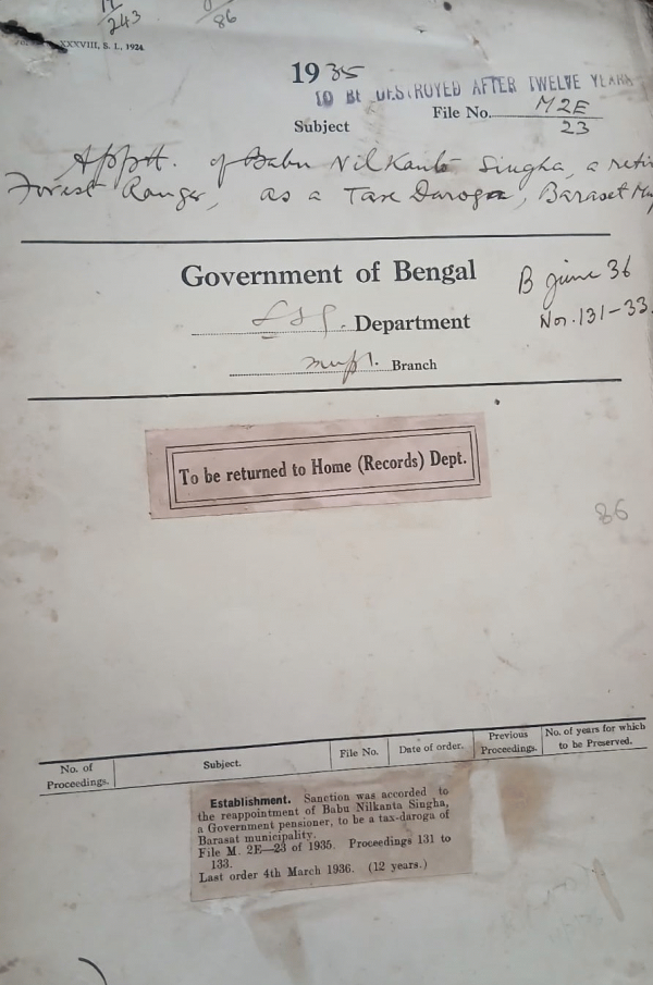 | Rack No. 12, Bundle No. 08 Sl No. 483 L.A. by the Baranagaore municipality for widening a portion of Kalidas Lahiri Lane. | Rack No. 12, Bundle No. 08 Sl No. 484 Notes of Audit of the Accounts of the Serajganj Municipality Pabna for 1933-34. | Rack No. 12, Bundle No. 08 Sl No. 485 Tours of inspection of the Honorable Member of the Executive Council and the Honorable Ministers in the presidency of Bengal. | Rack No. 12, Bundle No. 08 Sl No. 486 /35 Appointment of Babu Nilkanta Singha, a retired Forest Ranger, as a tax-daroga of Barasat Municipality | Rack No. 12, Bundle No. 08 Sl No. 487 Interpretation of the expectation" the minimum age of appointment" for the purpose of counting war service towards civil pension. | Rack No. 12, Bundle No. 08 Sl No. 488 Report on the working of the Municipalities in the Burdwan Division for the year 1934-35. | Rack No. 12, Bundle No. 08 Sl No. 489 Report on the working of the Municipality in the Dacca Division for the year 1934-35. |