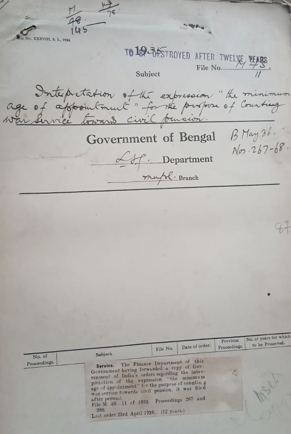 | Rack No. 12, Bundle No. 08 Sl No. 484 Notes of Audit of the Accounts of the Serajganj Municipality Pabna for 1933-34. | Rack No. 12, Bundle No. 08 Sl No. 485 Tours of inspection of the Honorable Member of the Executive Council and the Honorable Ministers in the presidency of Bengal. | Rack No. 12, Bundle No. 08 Sl No. 486 /35 Appointment of Babu Nilkanta Singha, a retired Forest Ranger, as a tax-daroga of Barasat Municipality | Rack No. 12, Bundle No. 08 Sl No. 487 Interpretation of the expectation" the minimum age of appointment" for the purpose of counting war service towards civil pension. | Rack No. 12, Bundle No. 08 Sl No. 488 Report on the working of the Municipalities in the Burdwan Division for the year 1934-35. | Rack No. 12, Bundle No. 08 Sl No. 489 Report on the working of the Municipality in the Dacca Division for the year 1934-35. | Rack No. 12, Bundle No. 08 Sl No. 490 Report on the working of the Municipalities in the Chittagong Division for the year 1934-35. |