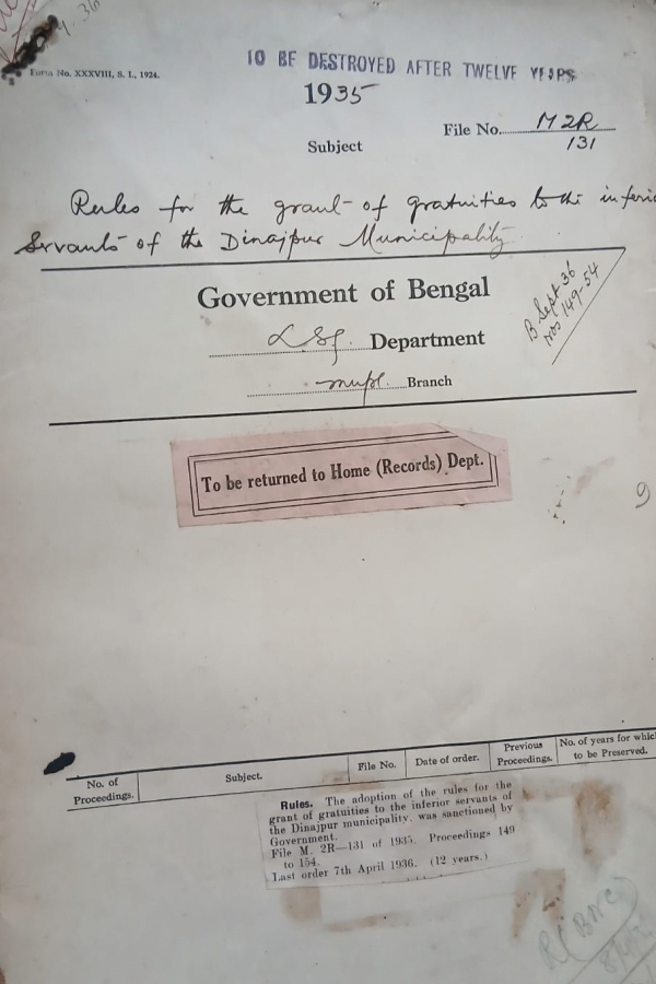 | Rack No. 12, Bundle No. 08 Sl No. 488 Report on the working of the Municipalities in the Burdwan Division for the year 1934-35. | Rack No. 12, Bundle No. 08 Sl No. 489 Report on the working of the Municipality in the Dacca Division for the year 1934-35. | Rack No. 12, Bundle No. 08 Sl No. 490 Report on the working of the Municipalities in the Chittagong Division for the year 1934-35. | Rack No. 12, Bundle No. 08 Sl No. 491 Rules for the grant of gratuities to the inferior Servants of the Dinajpur Municipality | Rack No. 12, Bundle No. 08 Sl No. 492 Transfer of a portion of water rate fund to Latrine fund, Midnapure Municipality. | Rack No. 12, Bundle No. 08 Sl No. 493 Utilization of the balance of the Latrine fund towards its general fund by the Katwa Municipality. | Rack No. 12, Bundle No. 08 Sl No. 494 Leasing out of a plot of P.W.D. Land to the Serajganj Municipality for the erection of a pound. |