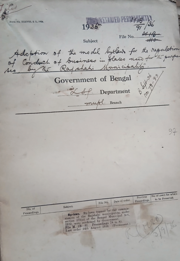 | Rack No. 12, Bundle No. 08 Sl No. 494 Leasing out of a plot of P.W.D. Land to the Serajganj Municipality for the erection of a pound. | Rack No. 12, Bundle No. 08 Sl No. 495 Adoption of model bye-laws regarding prohibition and regulation of traffic, by the Pabna Municipality. | Rack No. 12, Bundle No. 08 Sl No. 496 Adoption of model bye-laws regarding Standardization of weights and measures by the Kotrung Municipality. | Rack No. 12, Bundle No. 08 Sl No. 497 Adoption of the model bye-laws for the regulation of conduct of business in places used for the purposes by the Rajshahi Municipality. | Rack No. 12, Bundle No. 08 Sl No. 498 Adoption of the model bye-laws for the Control of dangerous, by the Bally Municipality. | Rack No. 12, Bundle No. 08 Sl No. 499 Declaration of Certain posts in the land Acquisition officer, Calcutta, as permanent posts. | Rack No. 12, Bundle No. 08 Sl No. 500 Appointment of a Commissioner, Kotrung Municipality. |