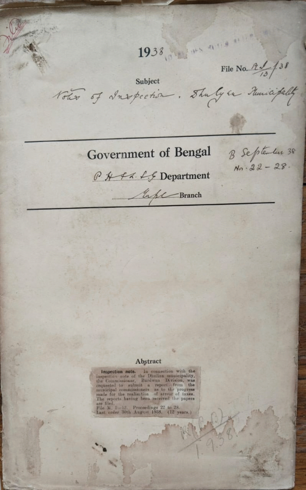 | Rack No. 12, Bundle No. 13, Sl No. 897 Amendment of the Provident Fund Rules of the Kamarhaty Municipality. | Rack No. 12, Bundle No. 13, Sl No. 898 Govt. Sanction was accorded to the Leasing out of a plot of land being a part of the foot path of the P.K. Mukharji Road to Calcutta Corporation. | Rack No. 12, Bundle No. 13, Sl No. 899 Removal of the elected commissioners of the Gobardanga Municipality. | Rack No. 12, Bundle No. 13, Sl No. 900 Notes of Inspection Dhulian Municipality. | Rack No. 12, Bundle No. 13, Sl No. 901 L.A. by the Chittagong Municipality for Public Purpose. | Rack No. 12, Bundle No. 13, Sl No. 902 L.A. by the Hooghly Chinsurah Municipality for Children's Park and Play ground at Kadamtala. | Rack No. 12, Bundle No. 13, Sl No. 903 L.A. by the Cal. I. Trust for alignment No. III (Maniktala). |