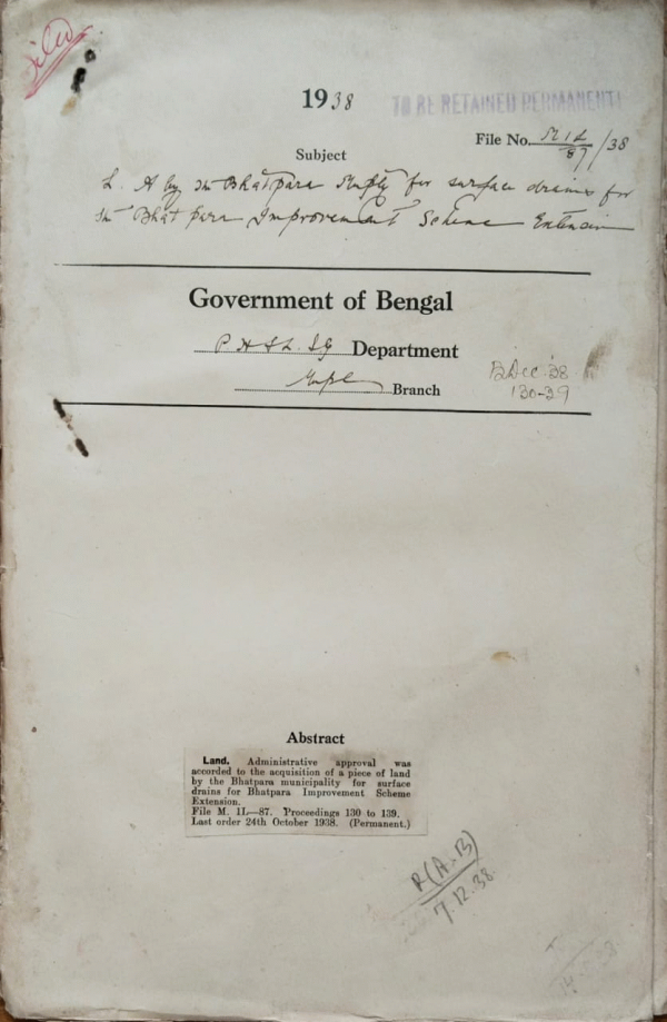 | Rack No. 12, Bundle No. 13, Sl No. 903 L.A. by the Cal. I. Trust for alignment No. III (Maniktala). | Rack No. 12, Bundle No. 13, Sl No. 904 L.A. by the Baranagore municipality for widening a Junction of Alambazar Chowrastha. | Rack No. 12, Bundle No. 13, Sl No. 905 Adoption of model By-laws regarding Standardization of Columns and measured. | Rack No. 12, Bundle No. 13, Sl No. 906 L.A. by the Bhatpara Municipality for Surface drains for Bhatpara Improvement Scheme Extension | Rack No. 12, Bundle No. 13, Sl No. 907 Attachment an P.F. accounts of retired employees of Cal. Improvement Trust. | Rack No. 12, Bundle No. 13, Sl No. 908 Grant of Concessions with regarding to leave and Provident fund to Mr. Parks Dy. Valuer of the Cal. 9. Trust | Rack No. 12, Bundle No. 13, Sl No. 909 Purchase of two new typewriters Machines. |