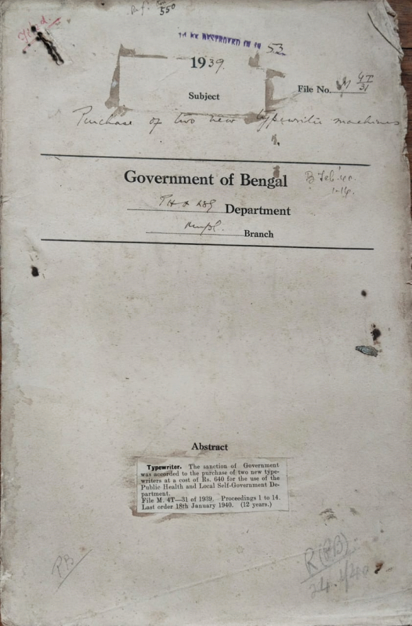 | Rack No. 12, Bundle No. 13, Sl No. 906 L.A. by the Bhatpara Municipality for Surface drains for Bhatpara Improvement Scheme Extension | Rack No. 12, Bundle No. 13, Sl No. 907 Attachment an P.F. accounts of retired employees of Cal. Improvement Trust. | Rack No. 12, Bundle No. 13, Sl No. 908 Grant of Concessions with regarding to leave and Provident fund to Mr. Parks Dy. Valuer of the Cal. 9. Trust | Rack No. 12, Bundle No. 13, Sl No. 909 Purchase of two new typewriters Machines. | Rack No. 12, Bundle No. 13, Sl No. 910 Baghbazar Street and Kantapukur Lane in Calcutta were declared main thoroughfares under the Bengal Suppression of Immoral Traffic Act. | Rack No. 12, Bundle No. 13, Sl No. 911 Proposal for Postponement of the revision of the Baruipore Municipality for a Period of 3 years up to March 1942. | Rack No. 12, Bundle No. 13, Sl No. 912 Anglo Seamise Commercial Treaty, 1937. |