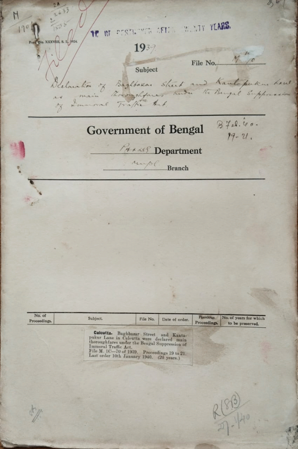 | Rack No. 12, Bundle No. 13, Sl No. 907 Attachment an P.F. accounts of retired employees of Cal. Improvement Trust. | Rack No. 12, Bundle No. 13, Sl No. 908 Grant of Concessions with regarding to leave and Provident fund to Mr. Parks Dy. Valuer of the Cal. 9. Trust | Rack No. 12, Bundle No. 13, Sl No. 909 Purchase of two new typewriters Machines. | Rack No. 12, Bundle No. 13, Sl No. 910 Baghbazar Street and Kantapukur Lane in Calcutta were declared main thoroughfares under the Bengal Suppression of Immoral Traffic Act. | Rack No. 12, Bundle No. 13, Sl No. 911 Proposal for Postponement of the revision of the Baruipore Municipality for a Period of 3 years up to March 1942. | Rack No. 12, Bundle No. 13, Sl No. 912 Anglo Seamise Commercial Treaty, 1937. | Rack No. 12, Bundle No. 13, Sl No. 913 Condonation of irregular expenditure incurred by the Noakhali Municipality on works done on roads in the Municipal area of Noakhali. |