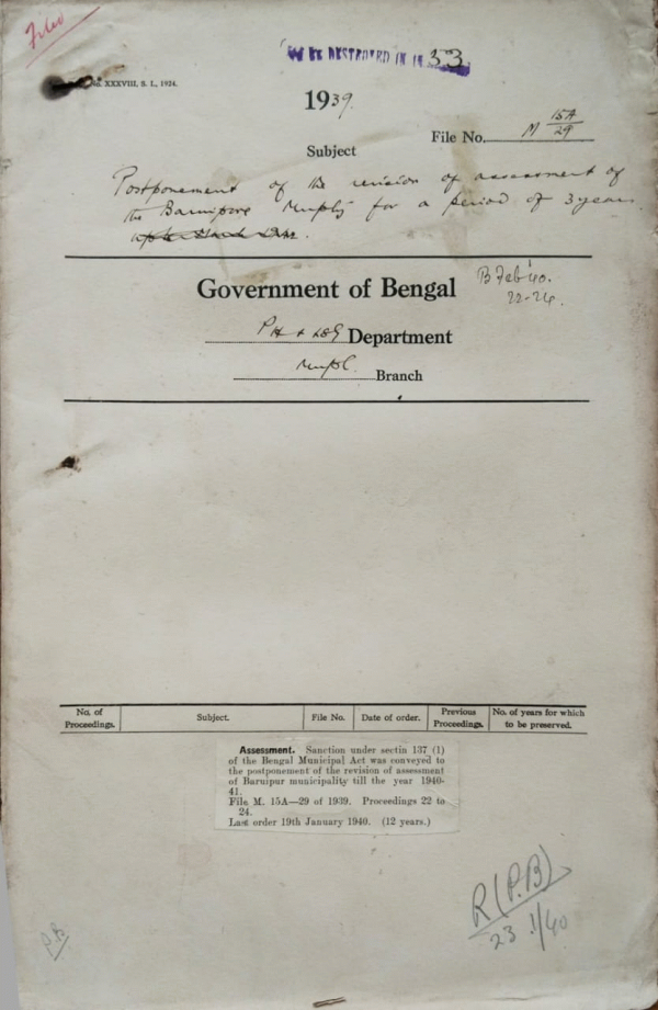 | Rack No. 12, Bundle No. 13, Sl No. 908 Grant of Concessions with regarding to leave and Provident fund to Mr. Parks Dy. Valuer of the Cal. 9. Trust | Rack No. 12, Bundle No. 13, Sl No. 909 Purchase of two new typewriters Machines. | Rack No. 12, Bundle No. 13, Sl No. 910 Baghbazar Street and Kantapukur Lane in Calcutta were declared main thoroughfares under the Bengal Suppression of Immoral Traffic Act. | Rack No. 12, Bundle No. 13, Sl No. 911 Proposal for Postponement of the revision of the Baruipore Municipality for a Period of 3 years up to March 1942. | Rack No. 12, Bundle No. 13, Sl No. 912 Anglo Seamise Commercial Treaty, 1937. | Rack No. 12, Bundle No. 13, Sl No. 913 Condonation of irregular expenditure incurred by the Noakhali Municipality on works done on roads in the Municipal area of Noakhali. | Rack No. 12, Bundle No. 13, Sl No. 914 Grant of gratuity to the retired road Sadar, by the Baidyabati Municipality. |