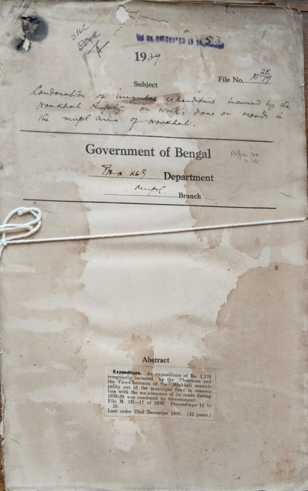| Rack No. 12, Bundle No. 13, Sl No. 910 Baghbazar Street and Kantapukur Lane in Calcutta were declared main thoroughfares under the Bengal Suppression of Immoral Traffic Act. | Rack No. 12, Bundle No. 13, Sl No. 911 Proposal for Postponement of the revision of the Baruipore Municipality for a Period of 3 years up to March 1942. | Rack No. 12, Bundle No. 13, Sl No. 912 Anglo Seamise Commercial Treaty, 1937. | Rack No. 12, Bundle No. 13, Sl No. 913 Condonation of irregular expenditure incurred by the Noakhali Municipality on works done on roads in the Municipal area of Noakhali. | Rack No. 12, Bundle No. 13, Sl No. 914 Grant of gratuity to the retired road Sadar, by the Baidyabati Municipality. | Rack No. 12, Bundle No. 13, Sl No. 915 Withdrawal of Provident Fund by Babu Moni Lal Chatterjee, a typist of the department of Public Health and L.S.G. | Rack No. 12, Bundle No. 14, Sl No. 916 L.A. report 1934-35, Para 18(d) Barisal, Joynagar, Ranaghat, Gouripur and Bhola Municipality. |