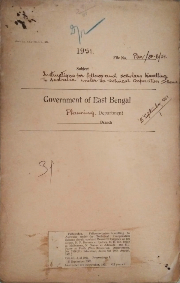 | Rack No. 36, Bundle No. 02, SI No. 152(A) Inter dominion conference decisions arrived at. | Rack No. 36, Bundle No. 03, SI No. 153 Recruitment of technical expert from the interactional refugee organization. | Rack No. 36, Bundle No. 03, SI No. 154 Stockpiling of essential commodities intent for 12/18 months. | Rack No. 36, Bundle No. 03, SI No. 155 Instructions for fellows and Scholars travelling to Australia under the technical cooperation Scheme. | Rack No. 36, Bundle No. 03, SI No. 156 Pakistan today and to-morrow. | Rack No. 36, Bundle No. 03, SI No. 157 Development schemes approved by the development board East Bengal list. | Rack No. 36, Bundle No. 03, SI No. 158 Foreign Exchange sanction of the ministry of finance govt. of pakistan to be obtained in all cases of govt. officials and ministers travelling abroad on duty. |