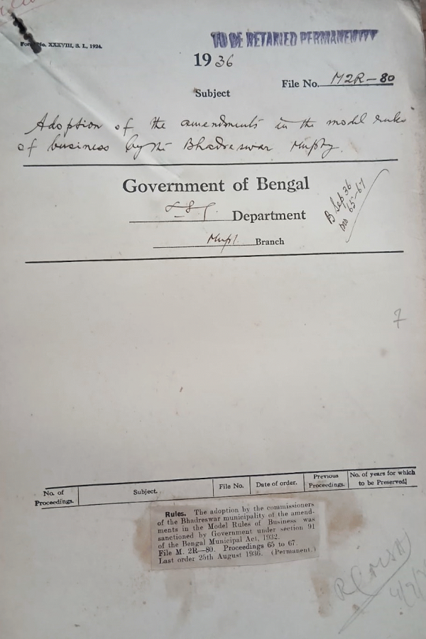 | Rack No. 12, Bundle No. 08 Sl No. 504 Application in the District of Darjeeling of the rules, bye-laws etc framed under the Bengal Municipal Act, 1939. | Rack No. 12, Bundle No. 08 Sl No. 505 Exchange of Publications with those of the govt. of Bombay on reciprocal basis. | Rack No. 12, Bundle No. 08 Sl No. 506 Adoption of the amendments of the model prov. fund Rules by the Titagarh Municipality. | Rack No. 12, Bundle No. 08 Sl No. 507 Adoption of the amendments in the model rules of business by the Bhadreswar Municipality. | Rack No. 12, Bundle No. 08 Sl No. 508 Contributions to the Berhampore pasteur institute and Behra Leprosy Clinic for the years 1934-35. | Rack No. 12, Bundle No. 08 Sl No. 509 Transfer of a portion of the Kandi thana Land to the Kandi Municipality for the Construction of a new road. | Rack No. 12, Bundle No. 08 Sl No. 510 Election of member Calcutta Improvement Trust. |