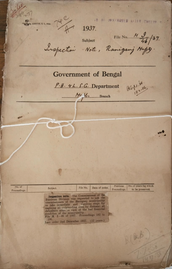 | Rack No. 12, Bundle No. 14, Sl No. 918 L.A. by the Brahmanbaria Municipality for opening a road in Tantrahati in the village of B. Baria. | Rack No. 12, Bundle No. 14, Sl No. 919 L.A. by the North Barrackpore Municipality for a public Landing Stage at Ishapore. | Rack No. 12, Bundle No. 14, Sl No. 920 Contribution by the Hooghly Chinsurah Municipality to Certain Associations for improvement of Physical Culture. | Rack No. 12, Bundle No. 14, Sl No. 921 Inspection Note, Raniganj Municipality. | Rack No. 12, Bundle No. 14, Sl No. 922 Rules regulating the hoisting of flags supplied to govt, Buildings in Bengal. | Rack No. 12, Bundle No. 14, Sl No. 923 Notes of audit of the accounts of the Burdwan Municipality. | Rack No. 12, Bundle No. 14, Sl No. 924 L.A. by Howrah Municipality for widening a portion of Panchanan Chatterjee Lane. |