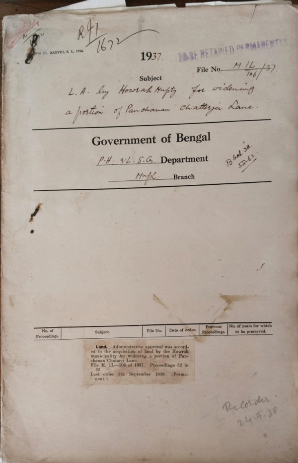 | Rack No. 12, Bundle No. 14, Sl No. 921 Inspection Note, Raniganj Municipality. | Rack No. 12, Bundle No. 14, Sl No. 922 Rules regulating the hoisting of flags supplied to govt, Buildings in Bengal. | Rack No. 12, Bundle No. 14, Sl No. 923 Notes of audit of the accounts of the Burdwan Municipality. | Rack No. 12, Bundle No. 14, Sl No. 924 L.A. by Howrah Municipality for widening a portion of Panchanan Chatterjee Lane. | Rack No. 12, Bundle No. 14, Sl No. 925 List of Municipality where action under Sec. 18 of the B.M. Act, 1932 was Taken. | Rack No. 12, Bundle No. 14, Sl No. 926 C.Q. by Mr. Liatafat Hossain, M.L.C. regarding Personnel of the Education Committee of the Bhatpara Municipality. | Rack No. 12, Bundle No. 14, Sl No. 927 Suppression of the Midnapore Municipality. |