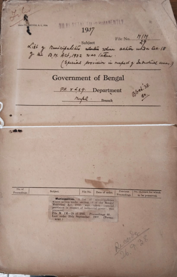 | Rack No. 12, Bundle No. 14, Sl No. 922 Rules regulating the hoisting of flags supplied to govt, Buildings in Bengal. | Rack No. 12, Bundle No. 14, Sl No. 923 Notes of audit of the accounts of the Burdwan Municipality. | Rack No. 12, Bundle No. 14, Sl No. 924 L.A. by Howrah Municipality for widening a portion of Panchanan Chatterjee Lane. | Rack No. 12, Bundle No. 14, Sl No. 925 List of Municipality where action under Sec. 18 of the B.M. Act, 1932 was Taken. | Rack No. 12, Bundle No. 14, Sl No. 926 C.Q. by Mr. Liatafat Hossain, M.L.C. regarding Personnel of the Education Committee of the Bhatpara Municipality. | Rack No. 12, Bundle No. 14, Sl No. 927 Suppression of the Midnapore Municipality. | Rack No. 12, Bundle No. 14, Sl No. 928 Postponement of the revision of assessment of the Bhadreswar Municipality. |