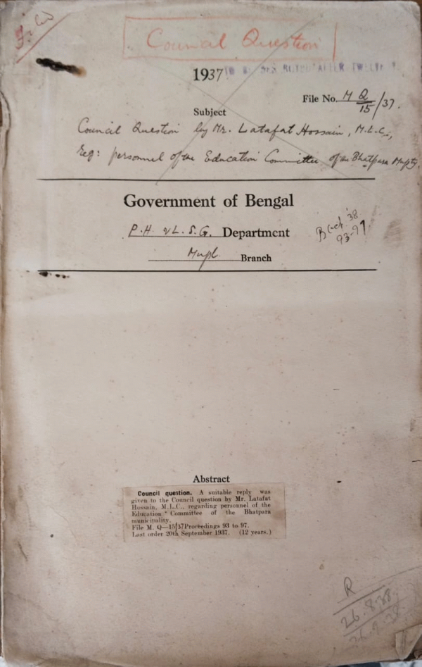 | Rack No. 12, Bundle No. 14, Sl No. 923 Notes of audit of the accounts of the Burdwan Municipality. | Rack No. 12, Bundle No. 14, Sl No. 924 L.A. by Howrah Municipality for widening a portion of Panchanan Chatterjee Lane. | Rack No. 12, Bundle No. 14, Sl No. 925 List of Municipality where action under Sec. 18 of the B.M. Act, 1932 was Taken. | Rack No. 12, Bundle No. 14, Sl No. 926 C.Q. by Mr. Liatafat Hossain, M.L.C. regarding Personnel of the Education Committee of the Bhatpara Municipality. | Rack No. 12, Bundle No. 14, Sl No. 927 Suppression of the Midnapore Municipality. | Rack No. 12, Bundle No. 14, Sl No. 928 Postponement of the revision of assessment of the Bhadreswar Municipality. | Rack No. 12, Bundle No. 14, Sl No. 929 Adoption of the Model Building Bye-laws u/s 328 of the B.M. Act, by the Bankura Municpality. |