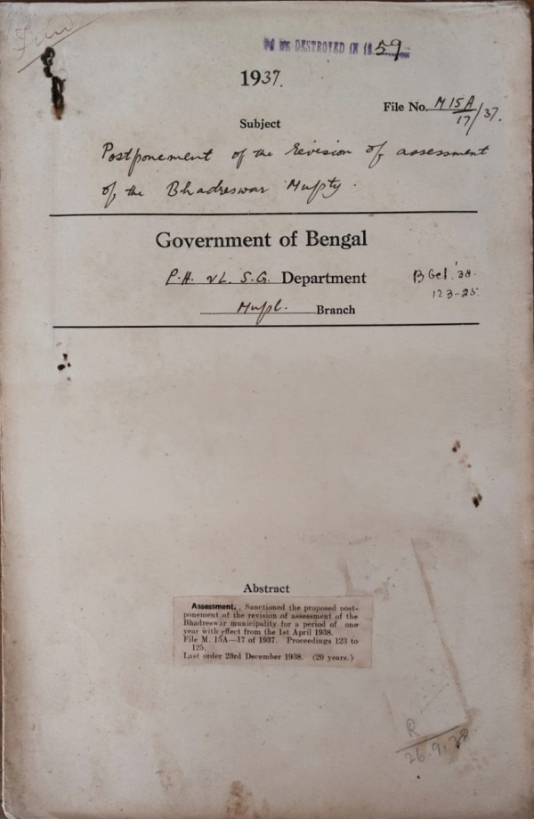 | Rack No. 12, Bundle No. 14, Sl No. 925 List of Municipality where action under Sec. 18 of the B.M. Act, 1932 was Taken. | Rack No. 12, Bundle No. 14, Sl No. 926 C.Q. by Mr. Liatafat Hossain, M.L.C. regarding Personnel of the Education Committee of the Bhatpara Municipality. | Rack No. 12, Bundle No. 14, Sl No. 927 Suppression of the Midnapore Municipality. | Rack No. 12, Bundle No. 14, Sl No. 928 Postponement of the revision of assessment of the Bhadreswar Municipality. | Rack No. 12, Bundle No. 14, Sl No. 929 Adoption of the Model Building Bye-laws u/s 328 of the B.M. Act, by the Bankura Municpality. | Rack No. 12, Bundle No. 14, Sl No. 930 Returns showing the work done by the Calcutta Improvement Tribunal during the quarter ending with the 31st October, 1936-30th April, 1937. | Rack No. 12, Bundle No. 14, Sl No. 931 A.Q. by the A. Quasem regarding the Calcutta Improvement Trust Scheme. |