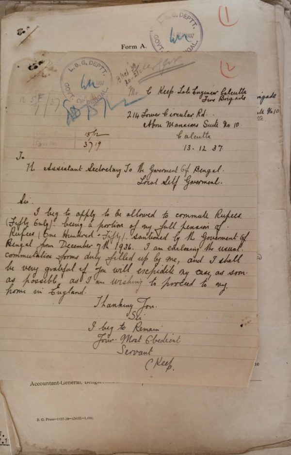 | Rack No. 12, Bundle No. 14, Sl No. 929 Adoption of the Model Building Bye-laws u/s 328 of the B.M. Act, by the Bankura Municpality. | Rack No. 12, Bundle No. 14, Sl No. 930 Returns showing the work done by the Calcutta Improvement Tribunal during the quarter ending with the 31st October, 1936-30th April, 1937. | Rack No. 12, Bundle No. 14, Sl No. 931 A.Q. by the A. Quasem regarding the Calcutta Improvement Trust Scheme. | Rack No. 12, Bundle No. 14, Sl No. 932 Apportionment of Pensioner Charges in respect of М. С. Кеер. | Rack No. 12, Bundle No. 14, Sl No. 933 Commutation of a portion of the pension of Mr. I.B. Reynolds, late Engineer, Calcutta Fire Brigade. | Rack No. 12, Bundle No. 14, Sl No. 934 CO by Mr. Naresh Nath Mukherjee M.L. regarding Paragraph in the Administration Report of Bengal for 1935-36 on Calcutta Corp. | Rack No. 12, Bundle No. 14, Sl No. 935 Revised estimate for 1938-40 u/h "57 Misc. Contribution for other for other purpose (Budget). |