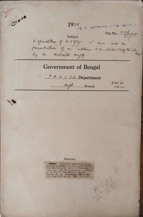 | Rack No. 12, Bundle No. 14, Sl No. 933 Commutation of a portion of the pension of Mr. I.B. Reynolds, late Engineer, Calcutta Fire Brigade. | Rack No. 12, Bundle No. 14, Sl No. 934 CO by Mr. Naresh Nath Mukherjee M.L. regarding Paragraph in the Administration Report of Bengal for 1935-36 on Calcutta Corp. | Rack No. 12, Bundle No. 14, Sl No. 935 Revised estimate for 1938-40 u/h "57 Misc. Contribution for other for other purpose (Budget). | Rack No. 12, Bundle No. 14, Sl No. 936 Expenditure of Rs. 27/8/ in connection with the to the Honorable Chief Minister, Bengal by the Naclchity Municipality. | Rack No. 12, Bundle No. 14, Sl No. 937 A.Q. by Babu Narndra Narayan Chakravarti regarding Beggars in Calcutta. | Rack No. 12, Bundle No. 14, Sl No. 938 A.Q. by Mr. M.A. H. Ispahani regarding Introduction of the Bill to amend the C.M. Act, 1923 | Rack No. 12, Bundle No. 14, Sl No. 939 A.Q. by Haji. Fariduddin Ahmed M.L.A. regarding the Standardization of weights and measures in Bengal. |