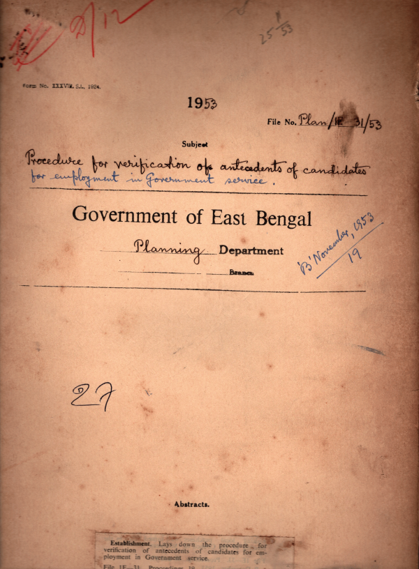 | Rack No. 37, Bundle No. 08, SI No. 408 Purchase of books from central publication Branch, Karachi. | Rack No. 37, Bundle No. 08, SI No. 409 Instruction regarding finalization appropriation accounts. | Rack No. 37, Bundle No. 08, SI No. 410 Question of bearing cost on journey undertaken by East- Bengal Scholars and officers to foreign Countries. | Rack No. 37, Bundle No. 08, SI No. 411 Procedure for verification of antecedent of candidates for employment in Government service | Rack No. 37, Bundle No. 08, SI No. 412 Question of re-employment of Government servants after retirement. | Rack No. 37, Bundle No. 08, SI No. 413 Police regarding purchase of stores on Govt. account through the Department of Supply &Development Government of Pakistan.t | Rack No. 37, Bundle No. 09, SI No. 414 Two offices of the Bureau were selected for training for 5th term of the International Science and Economic Council, Calcutta. |