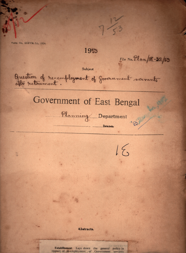 | Rack No. 37, Bundle No. 08, SI No. 409 Instruction regarding finalization appropriation accounts. | Rack No. 37, Bundle No. 08, SI No. 410 Question of bearing cost on journey undertaken by East- Bengal Scholars and officers to foreign Countries. | Rack No. 37, Bundle No. 08, SI No. 411 Procedure for verification of antecedent of candidates for employment in Government service | Rack No. 37, Bundle No. 08, SI No. 412 Question of re-employment of Government servants after retirement. | Rack No. 37, Bundle No. 08, SI No. 413 Police regarding purchase of stores on Govt. account through the Department of Supply &Development Government of Pakistan.t | Rack No. 37, Bundle No. 09, SI No. 414 Two offices of the Bureau were selected for training for 5th term of the International Science and Economic Council, Calcutta. | Rack No. 37, Bundle No. 09, SI No. 415 Annual report from the Director of Provincial Statistical Board and Bureau and its staff. |