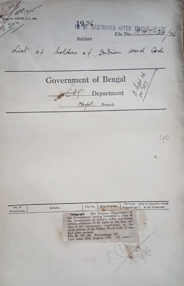 | Rack No. 12, Bundle No. 08 Sl No. 537 LA by the Comilla Municipality for Chritian Burial ground at Shashangacha. | Rack No. 12, Bundle No. 08 Sl No. 538 Revision of assessment of the Budge Budge Municipality | Rack No. 12, Bundle No. 08 Sl No. 539 Reduction in the grade pay of the Engineer and Sanitary Inspector, Burdwan Municipality. | Rack No. 12, Bundle No. 08 Sl No. 540 List of holders of Indian Word Code | Rack No. 12, Bundle No. 08 Sl No. 541 Adoption of model rules regarding Fining, Suspension and removal of municipal officers and Servants etc. by the Tollygonj Municipality. | Rack No. 12, Bundle No. 08 Sl No. 542 L.A. by the Pabna Municipality for the extension of the Mohammedar Burial ground. | Rack No. 12, Bundle No. 08 Sl No. 543 LA. by the Kanchrapara Municipality for a road to connect station road with E.B. Railway land in the village of Halisahar. |