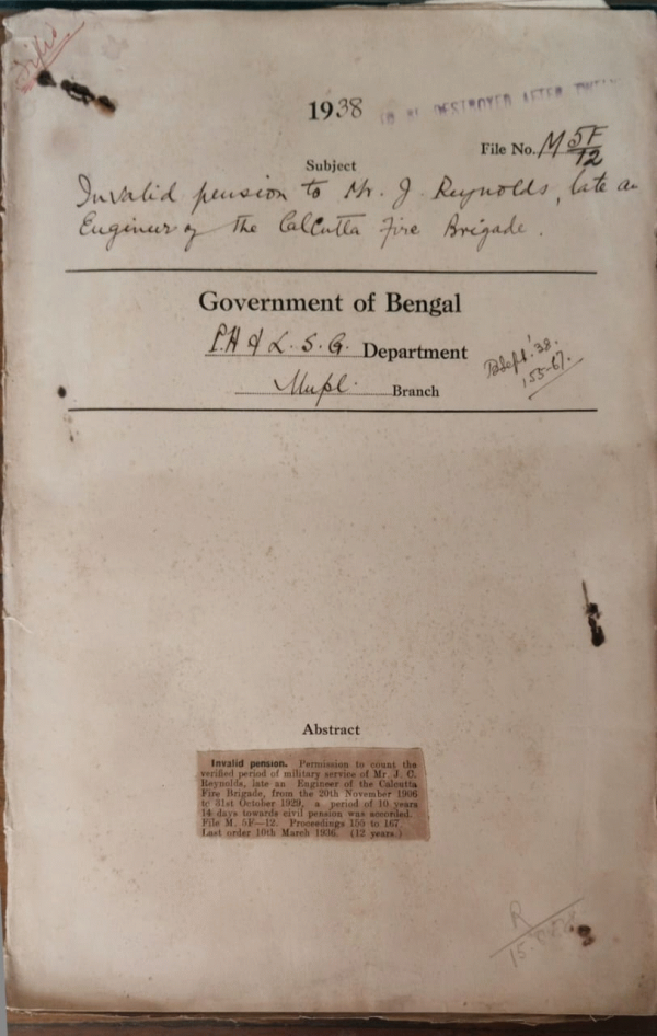 | Rack No. 12, Bundle No. 14, Sl No. 945 Expenditure of Rs. 34/11/9 incurred for Presentation by Khulna Municipality. | Rack No. 12, Bundle No. 14, Sl No. 946 L.A. by the Bhadreswar municipality for widening the Dakshinabati. | Rack No. 12, Bundle No. 14, Sl No. 947 L.A. by the Rajshahi Municipality for a Mohamendan Burial ground. | Rack No. 12, Bundle No. 14, Sl No. 948 Invalid pension to Mr. J.C. Reynolds, Late an Engineer of the Calcutta Fire Brigade. | Rack No. 12, Bundle No. 14, Sl No. 949 Reconstitution, Narayanganj Municipality. | Rack No. 12, Bundle No. 14, Sl No. 950 L.A. by the Karchrapara Municipality for a road to Connect Nalini Bose road with Katcharibari Road. | Rack No. 12, Bundle No. 14, Sl No. 951 C.Q. by Mr. Nur Ahmed, M.L.C., regarding officers employed the Municipalities of Bengal and the Strength of Muslims in them. |