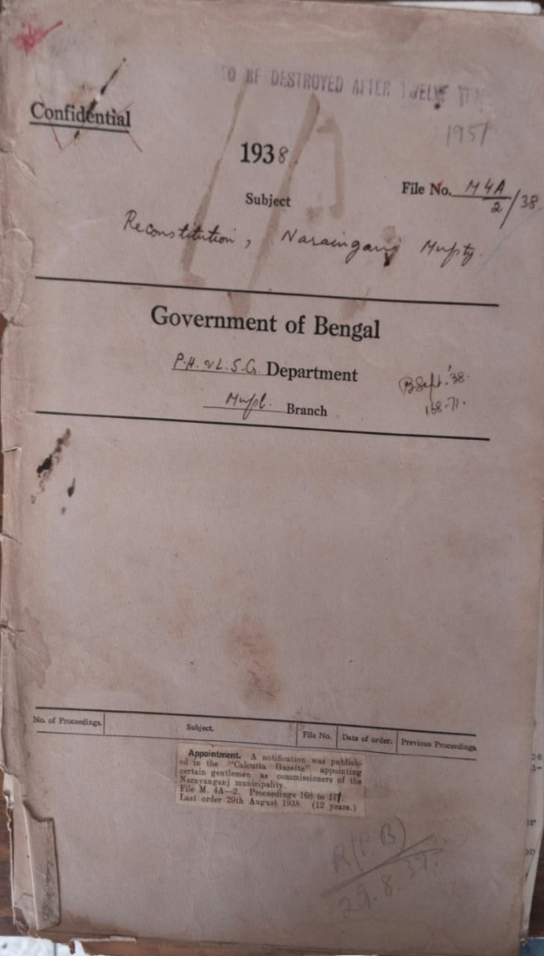 | Rack No. 12, Bundle No. 14, Sl No. 946 L.A. by the Bhadreswar municipality for widening the Dakshinabati. | Rack No. 12, Bundle No. 14, Sl No. 947 L.A. by the Rajshahi Municipality for a Mohamendan Burial ground. | Rack No. 12, Bundle No. 14, Sl No. 948 Invalid pension to Mr. J.C. Reynolds, Late an Engineer of the Calcutta Fire Brigade. | Rack No. 12, Bundle No. 14, Sl No. 949 Reconstitution, Narayanganj Municipality. | Rack No. 12, Bundle No. 14, Sl No. 950 L.A. by the Karchrapara Municipality for a road to Connect Nalini Bose road with Katcharibari Road. | Rack No. 12, Bundle No. 14, Sl No. 951 C.Q. by Mr. Nur Ahmed, M.L.C., regarding officers employed the Municipalities of Bengal and the Strength of Muslims in them. | Rack No. 12, Bundle No. 14, Sl No. 952 Contribution payable to the Calcutta Corp. during the during the year 1937-38 out of the Surplus of the Cal Hackney Carriage fund for the 1936-37. |