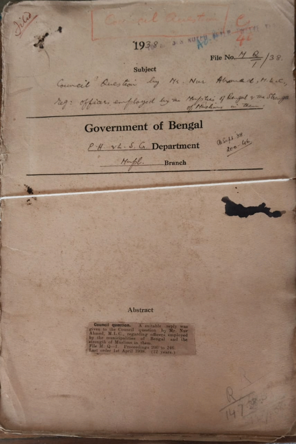 | Rack No. 12, Bundle No. 14, Sl No. 948 Invalid pension to Mr. J.C. Reynolds, Late an Engineer of the Calcutta Fire Brigade. | Rack No. 12, Bundle No. 14, Sl No. 949 Reconstitution, Narayanganj Municipality. | Rack No. 12, Bundle No. 14, Sl No. 950 L.A. by the Karchrapara Municipality for a road to Connect Nalini Bose road with Katcharibari Road. | Rack No. 12, Bundle No. 14, Sl No. 951 C.Q. by Mr. Nur Ahmed, M.L.C., regarding officers employed the Municipalities of Bengal and the Strength of Muslims in them. | Rack No. 12, Bundle No. 14, Sl No. 952 Contribution payable to the Calcutta Corp. during the during the year 1937-38 out of the Surplus of the Cal Hackney Carriage fund for the 1936-37. | Rack No. 12, Bundle No. 14, Sl No. 953 Raniganj Municipality Cancellation of notification u/s 18 increasing the appointed seat. | Rack No. 12, Bundle No. 14, Sl No. 954 P.F. Rules, Comilla Municipality. |