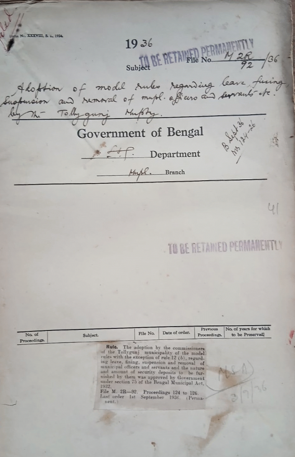 Adoption of model rules regarding Fining, Suspension and removal of municipal officers and Servants etc. by the Tollygonj Municipality.